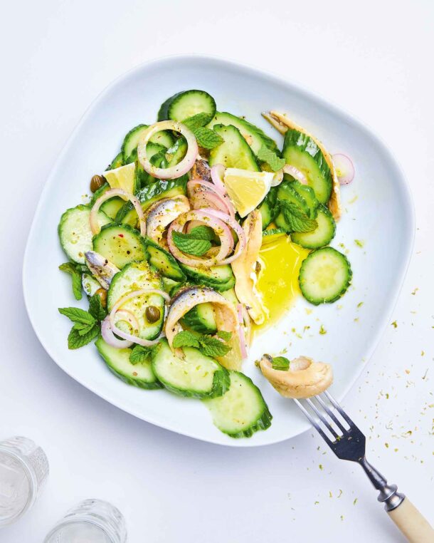 Η δροσιά και τα φίνα αρώματά της, κάνουν τούτη την αγγουροσαλάτα ιδανικό συνοδευτικό για κάθε λογής παστά ή καπνιστά ψάρια, συνοδεύει όμως και τις πιατέλες τυριών, λευκών ή κίτρινων.