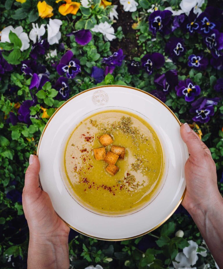 - Πολτοποιούμε τα υλικά μέσα στην κατσαρόλα με ραβδομπλέντερ (ή σε δόσεις στον πολυκόφτη), μέχρι να γίνουν μια βελούδινη σούπα. Αλατοπιπερώνουμε καλά και ανακατεύουμε.