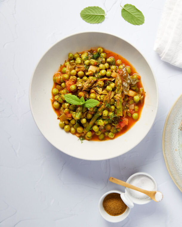 Σε ένα πιάτο όλη η άνοιξη! Τρυφερός αρακάς με αρωματικά αμπελόφυλλα και φίνα σπαράγγια σε ένα απίθανα πλούσιο και γευστικό λαδερό. Συνοδεύουμε με πικάντικη φέτα και ζεστό, προζυμένιο ψωμί.