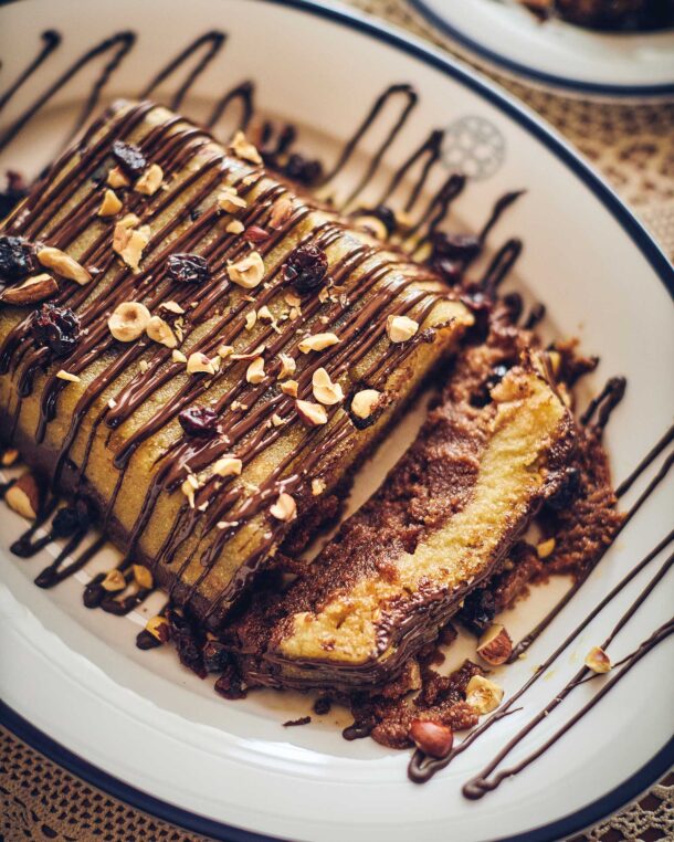 - Με ένα κουτάλι ρίχνουμε λίγη λιωμένη κουβερτούρα σε γραμμές πάνω στην επιφάνειά του και σερβίρουμε.