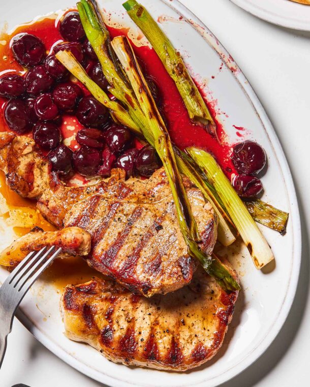 - Για τις χοιρινές μπριζόλες κόντρα με φρέσκο κρεμμυδάκι και καψαλισμένα κεράσια, αρχικά σε ένα μεγάλο αντικολλητικό τηγάνι ζεσταίνουμε 1-2 κουτ. σούπας από το ελαιόλαδο σε μέτρια προς δυνατή φωτιά και σοτάρουμε τα κεράσια για 8-10 λεπτά, μέχρι να μαλακώσουν, να ζαρώσει η φλούδα τους και να καψαλιστούν σε μερικά σημεία.