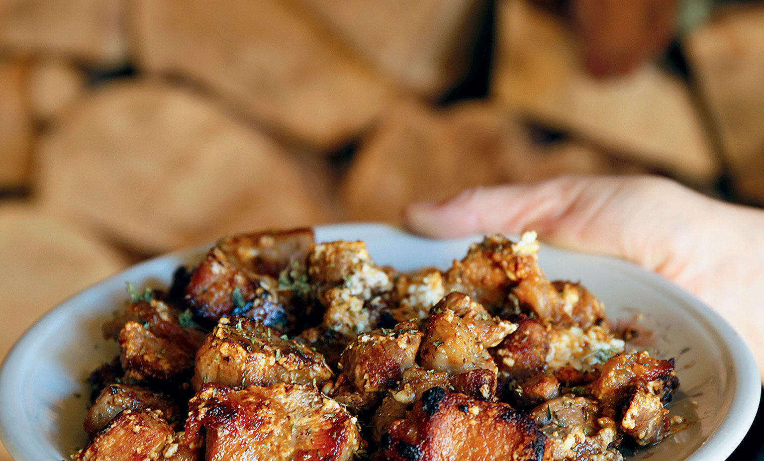 Στα Άγραφα, η τηγανιά είναι λιτή. Λίγο χοιρινό, φέτα που λιώνει πάνω στο ζεστό κρέας και, στο τέλος, ρίγανη για άρωμα. Μια εκδοχή απλή, χωρίς πράσα, τόσο νόστιμη που τρώγεται κατευθείαν από το τηγάνι.