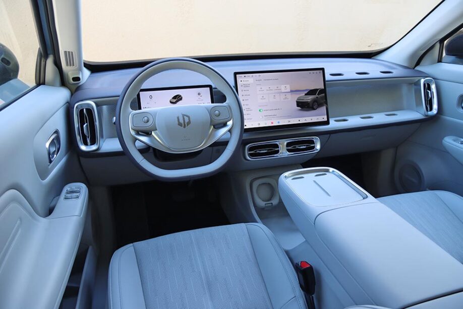 Στο εσωτερικό του Leapmotor Β10 κυριαρχεί η απλότητα στον σχεδιασμό με λιτές γραμμές, έμφαση στην τεχνολογία και στην πρακτικότητα. Στο ταμπλό οι εσοχές που σχηματίζονται αποτελούν μια ευχάριστη νότα, όμως και ο ατμοσφαιρικός φωτισμός με δυνατότητα επιλογής μεταξύ 64 χρωμάτων και με επιλογή συγχρονισμού με τη μουσική. Στο κέντρο κυριαρχεί η οθόνη αφής των 14,6 ιντσών (με ανάλυση 2.5K) για το σύστημα πολυμέσων, που υποστηρίζει το λειτουργικό LEAP OS 4.0 Plus. Τα γραφικά είναι μοντέρνα και η απόκριση άμεση, όμως από την οθόνη ελέγχονται όλες οι λειτουργίες του οχήματος. Γεγονός που δεν είναι ό,τι καλύτερο από πλευράς εργονομίας, αφού για απλές ρυθμίσεις απαιτούνται τουλάχιστον δύο κινήσεις (π.χ. ρύθμιση καθρεπτών). Η πλήρης απουσία φυσικών διακοπτών στην κεντρική κονσόλα, όπως και η τοποθέτηση του διακόπτη των αλάρμ στην οροφή δίπλα από το κουμπί SOS (μπορεί να πατηθεί κατά λάθος), είναι χαρακτηριστικά που θα πρέπει να επανεξεταστούν (ισχύει και για άλλα κινεζικά αυτοκίνητα). Μπροστά από τον οδηγό υπάρχει ένας ψηφιακός πίνακας οργάνων 8,8 ιντσών όπου προβάλλονται η ταχύτητα, ο χιλιομετρητής, η κατάσταση μπαταρίας, η κατανάλωση και δεδομένα ADAS σε πραγματικό χρόνο. Αμφότερες οι οθόνες ελέγχονται από έναν ισχυρό επεξεργαστή Snapdragon 8155 για δυνατότητες εξατομίκευσης και λειτουργία χωρίς κολλήματα. Από πλευράς ποιότητας, το ταμπλό του Leapmotor B10 είναι κατασκευασμένο εξολοκλήρου από σκληρά πλαστικά, γεγονός που ξενίζει αρχικά, δεδομένου ότι είναι ένα SUV της μικρομεσαίας κατηγορίας. Παρόλα αυτά είναι ανθεκτικά και πολύ στιβαρά συναρμολογημένα, όπως ισχύει και για τις υπόλοιπες επιμέρους επιφάνειες. Από την άλλη πλευρά, σε όλες τις πόρτες έχει γίνει χρήση λεπτών μαλακών υλικών στην περιοχή των αγκώνων και μέχρι τα παράθυρα.