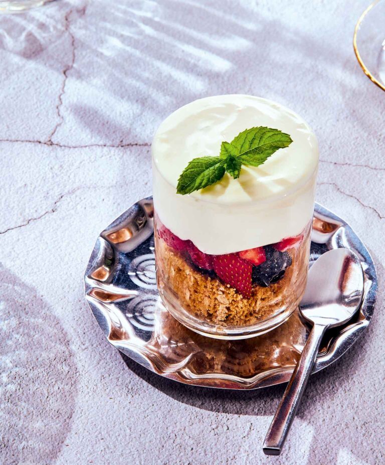 - Προσθέτουμε μερικά μούρα. Από πάνω βάζουμε την κρέμα γιαουρτιού και τελειώνουμε ξανά με μερικά μούρα και φυλλαράκια δυόσμου.