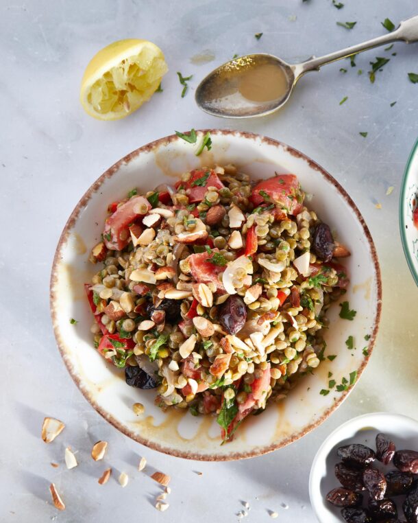 Δροσερή ντομάτα, πιπεριά Φλωρίνης, ελιές, αμύγδαλα, ταχίνι και κύμινο σε μια πλούσια και χορταστική φακοσαλάτα με ωραίες εντάσεις και μεσανατολίτικες νότες.