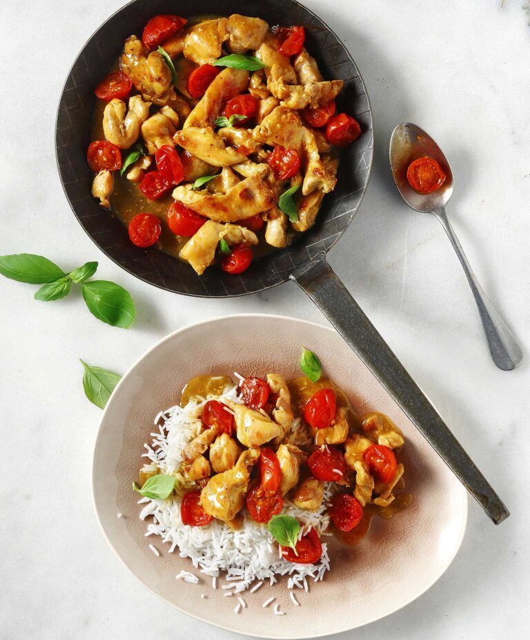 Ένα αφράτο ρύζι ή ευκολόβραστα νουντλς είναι το ιδανικό συνοδευτικό γι’ αυτό το γρήγορο και αρωματικό κοτόπουλο.