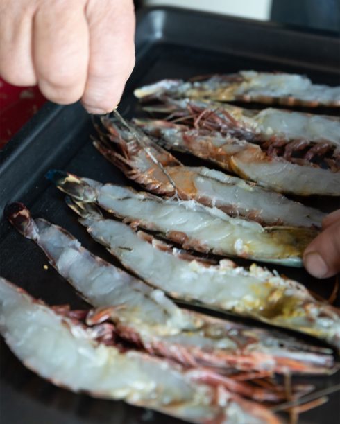 Παίρνουμε τις γαρίδες ξεπαγωμένες, και τις ακουμπάμε στο ξύλο κοπής με τα πόδια προς τα κάτω. Κρατάμε σταθερά τη γαρίδα με το ένα χέρι και με το άλλο κάνουμε μια τομή με μικρό κοφτερό μαχαίρι από τον αυχένα της (εκεί όπου ενώνεται με το κεφάλι) μέχρι την ουρά. Οι κινήσεις μας πρέπει να είναι σταθερές, αργές και σε ευθεία, ώστε η κάθε γαρίδα να κοπεί εντελώς στη μέση, σε δύο κομμάτια.