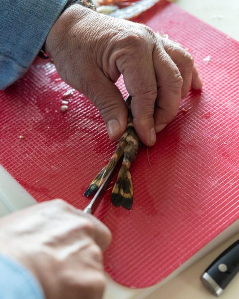 - Οι κινήσεις μας πρέπει να είναι σταθερές, αργές και σε ευθεία, ώστε η κάθε γαρίδα να κοπεί εντελώς στη μέση, σε δύο κομμάτια.