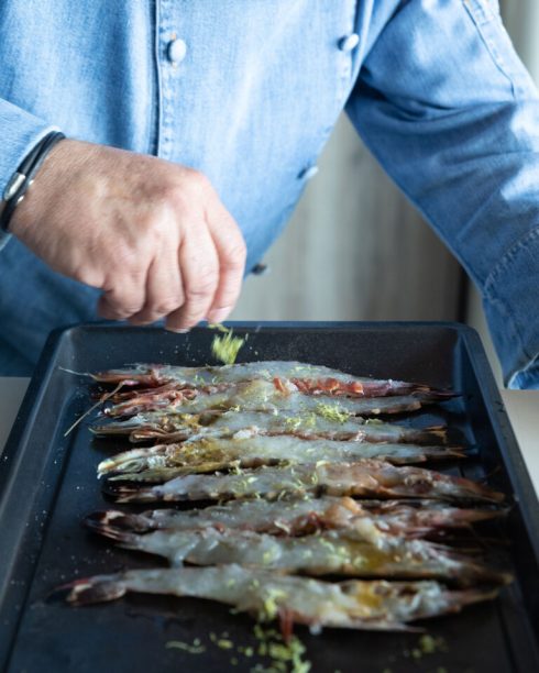 Η συνταγή φτιάχνεται με κάθε είδους γαρίδες, απλώς οι τζάμπο έχουν όγκο και είναι ψωμωμένες. Το ατού τους είναι ότι, όταν ψήνονται με το κέλυφος, διατηρούν τον όγκο τους. Αν τις ψήσουμε καθαρισμένες, θα τον χάσουν εντελώς και θα στεγνώσουν, θα μείνουν σχεδόν οι μισές. Αν επιλέξουμε μικρότερες όμως, τις ψήνουμε εντελώς καθαρισμένες, έως 1 λεπτό.