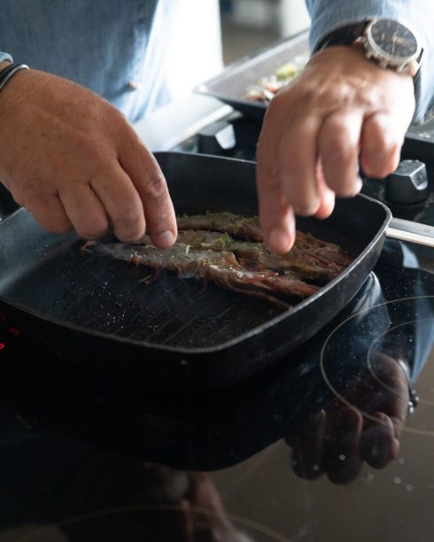 - Το βάζουμε να κάψει σε δυνατή φωτιά και ξαπλώνουμε τις κομμένες γαρίδες στη σειρά, με τη σάρκα προς τα πάνω.