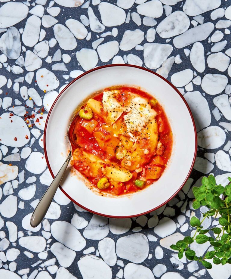 Με έμπνευση από την παραδοσιακή κεφαλονίτικη συνταγή, η σεφ Νένα Ισμυρνόγλου ετοιμάζει ένα ζουμερό, ντοματένιο, λιτό και πεντανόστιμο μαγειρευτό, κάτι ανάμεσα σε σούπα και γιαχνί.