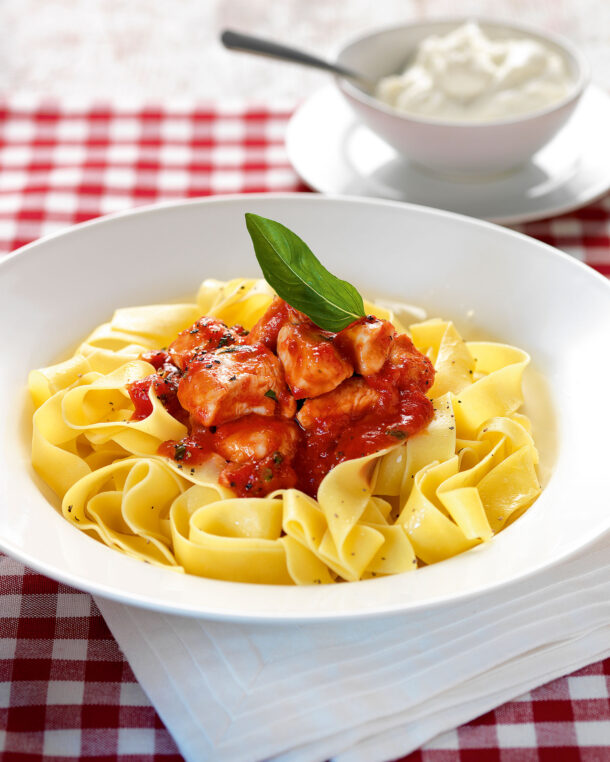 Η σεφ Νένα Ισμυρνόγλου «κοκκινίζει» τα φιλέτα κοτόπουλου στο άψε-σβήσε, τα συνδυάζει με τις αγαπημένες μας ταλιατέλες και δημιουργεί ένα μαγειρικό θαύμα.