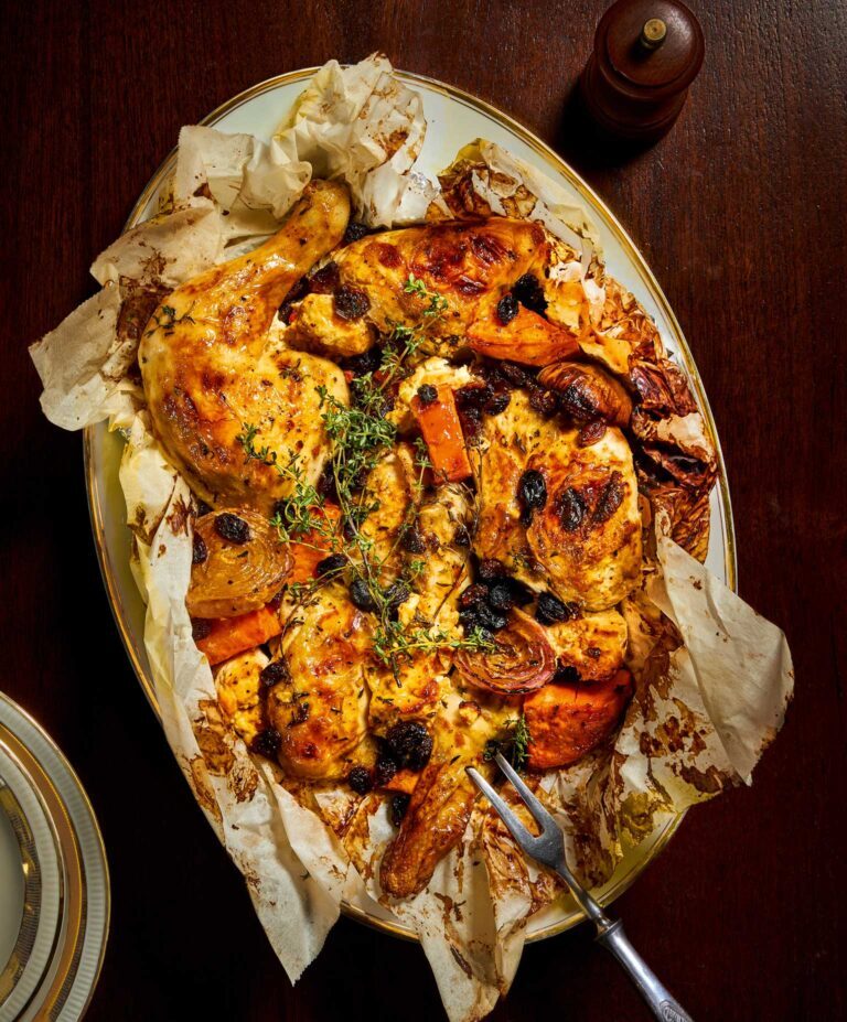 Το κοτόπουλο, ψημένο στη λαδόκολλα, παραμένει ζουμερό χωρίς να στεγνώνει και σε συνδυασμό με τις γλυκοπατάτες και τη μυζήθρα κλέβει τις εντυπώσεις.