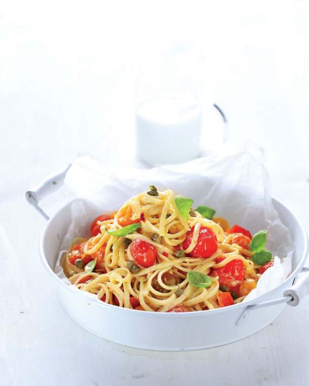 - Για να φτιάξουμε λιγκουίνι με σάλτσα ντομάτας, γιαούρτι και κάππαρη, ξεκινάμε βράζοντας τα μακαρόνια σύμφωνα με τις οδηγίες της συσκευασίας και τα στραγγίζουμε.