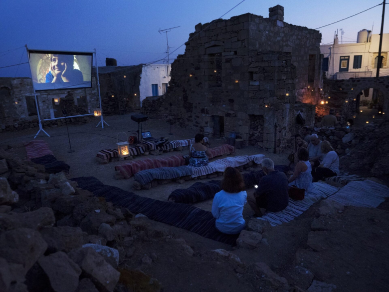 Αυτό όμως είναι μόνο ένα μέρος από τις 30 «αίθουσες» που στήνονται στο νησί. Ο Cine Καλησπερίτης, που συστήθηκε για πρώτη φορά σε ντόπιους και επισκέπτες το 2014 και πήρε το όνομά του από το πρώτο άστρο που βλέπει κανείς μόλις δύσει ο ήλιος, στήνεται μπροστά στη θάλασσα, σε σοκάκια, αλλά και σε παραδοσιακούς μύλους. Μετακινείται συνεχώς, κι αυτό είναι που τον κάνει ακόμα πιο μοναδικό. Απαραίτητη προϋπόθεση για να προγραμματιστούν οι προβολές, είναι να έχει μπουνάτσα. Την ημέρα που μίλησα στο τηλέφωνο μαζί του, ήταν σίγουρο πως δεν θα γινόταν καμία προβολή – ο αέρας ηχούσε δυνατός στην άλλη άκρη της γραμμής.