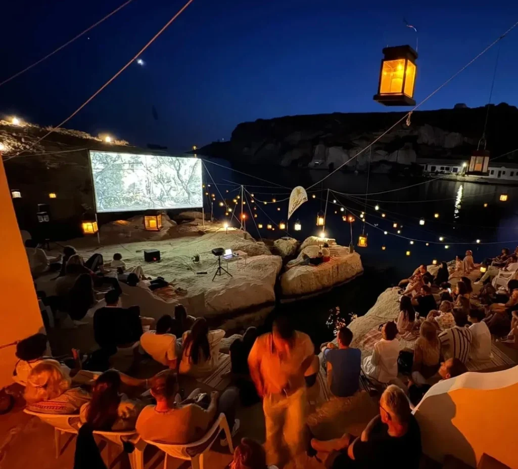Αυτό όμως είναι μόνο ένα μέρος από τις 30 «αίθουσες» που στήνονται στο νησί. Ο Cine Καλησπερίτης, που συστήθηκε για πρώτη φορά σε ντόπιους και επισκέπτες το 2014 και πήρε το όνομά του από το πρώτο άστρο που βλέπει κανείς μόλις δύσει ο ήλιος, στήνεται μπροστά στη θάλασσα, σε σοκάκια, αλλά και σε παραδοσιακούς μύλους. Μετακινείται συνεχώς, κι αυτό είναι που τον κάνει ακόμα πιο μοναδικό. Απαραίτητη προϋπόθεση για να προγραμματιστούν οι προβολές, είναι να έχει μπουνάτσα. Την ημέρα που μίλησα στο τηλέφωνο μαζί του, ήταν σίγουρο πως δεν θα γινόταν καμία προβολή – ο αέρας ηχούσε δυνατός στην άλλη άκρη της γραμμής.