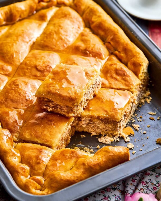 - Βουτυρώνουμε γενναιόδωρα ένα ταψί με διαστάσεις 25 x 35 εκ.