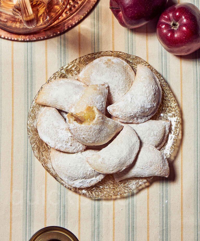 - Γεμίζουμε κάθε δίσκο με 1 κουτ. γλυκού κομποτέ μήλου και διπλώνουμε σε μισοφέγγαρα, πατώντας με τα δάχτυλά μας τις άκρες ώστε να σφραγίσουν.