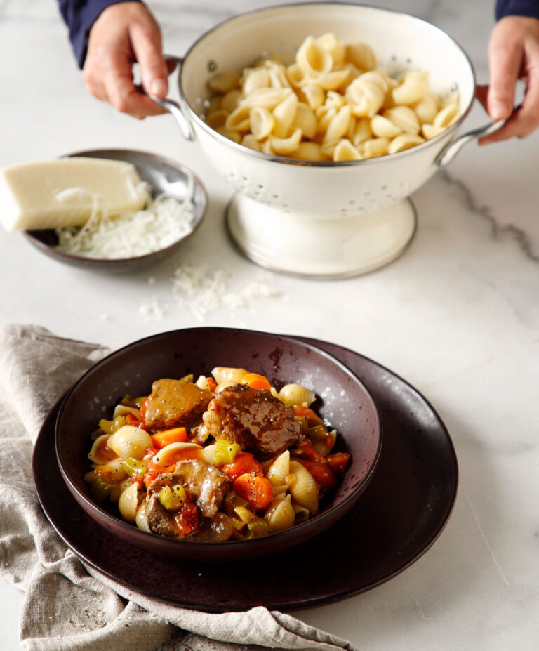 Όταν θέλουμε ένα εύκολο, νόστιμο, κόμφορτ φαγητό για το Σαββατοκύριακο, το κοκκινιστό με ζυμαρικά έρχεται πρώτο στη λίστα. Λίγη τριμμένη παρμεζάνα τού πάει πολύ.