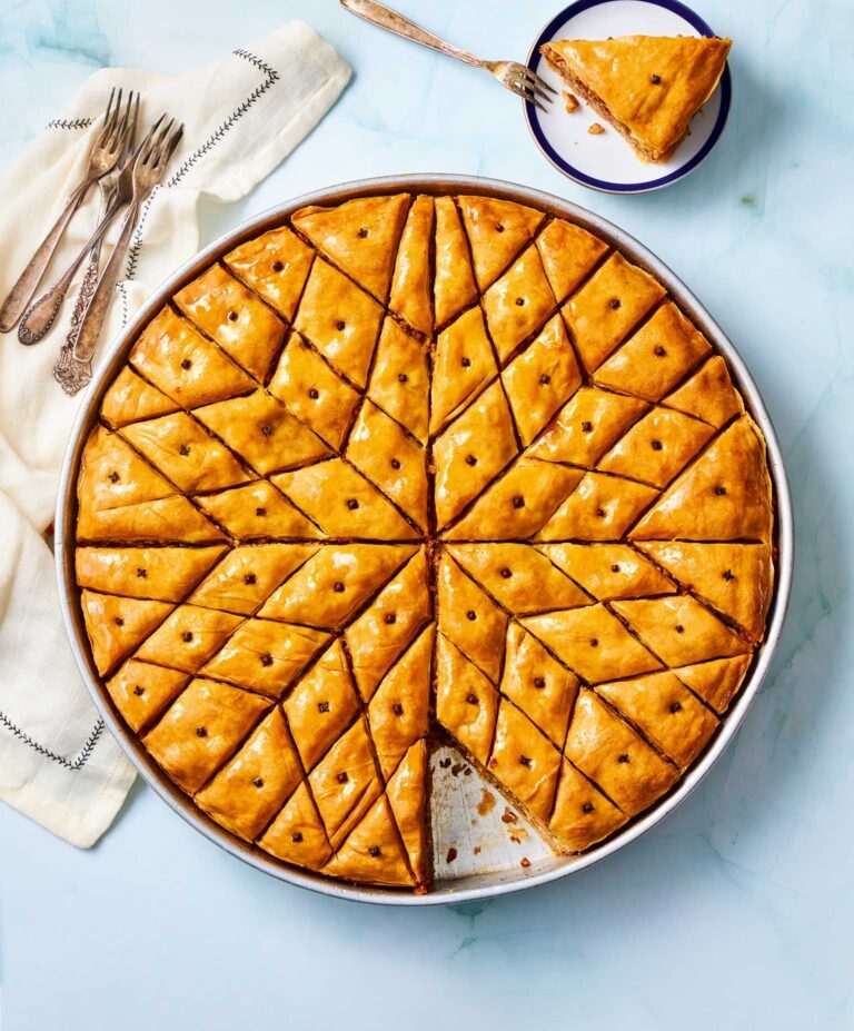 Ένας χρυσαφένιος, λαχταριστά κριτσανιστός μπακλαβάς με προζυμένιο φύλλο. Η συνταγή είναι από το Νυμφαίο, όπου παραδοσιακά ο μπακλαβάς είχε τον ρόλο της βασιλόπιτας.