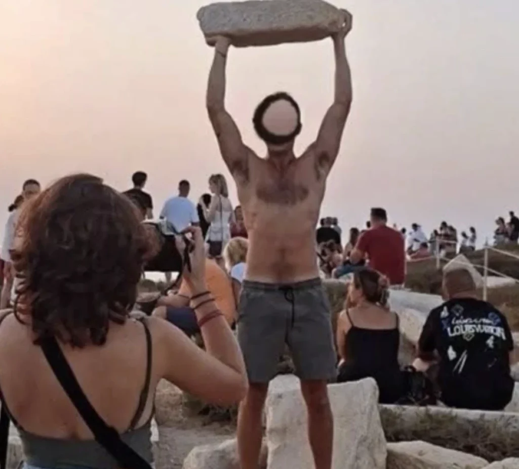 Ο τουρίστας, όπως φαίνεται στη φωτογραφία, σήκωσε το μάρμαρο άνω των 2.500 ετών, χωρίς προφανώς να σκεφτεί την πιθανότητα να του έπεφτε και να έσπαζε ή να ράγιζε ένα ανεκτίμητο τεκμήριο της πολιτιστικής κληρονομιάς της Ελλάδας.