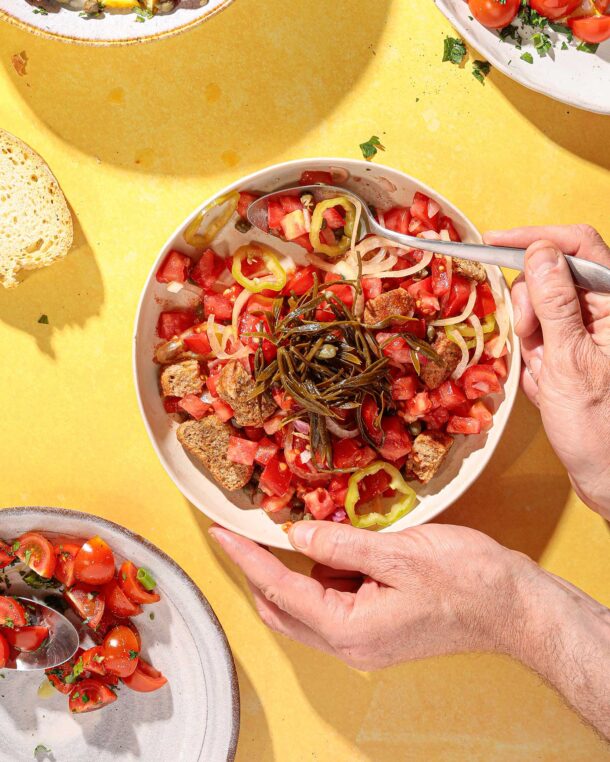 Με τις κατακόκκινες ντομάτες του καλοκαιριού, κρίταμο, πιπεριές, κάππαρη και παξιμάδια, κάνουμε μια σαλάτα όνειρο. Νόστιμη, θρεπτική και χορταστική.