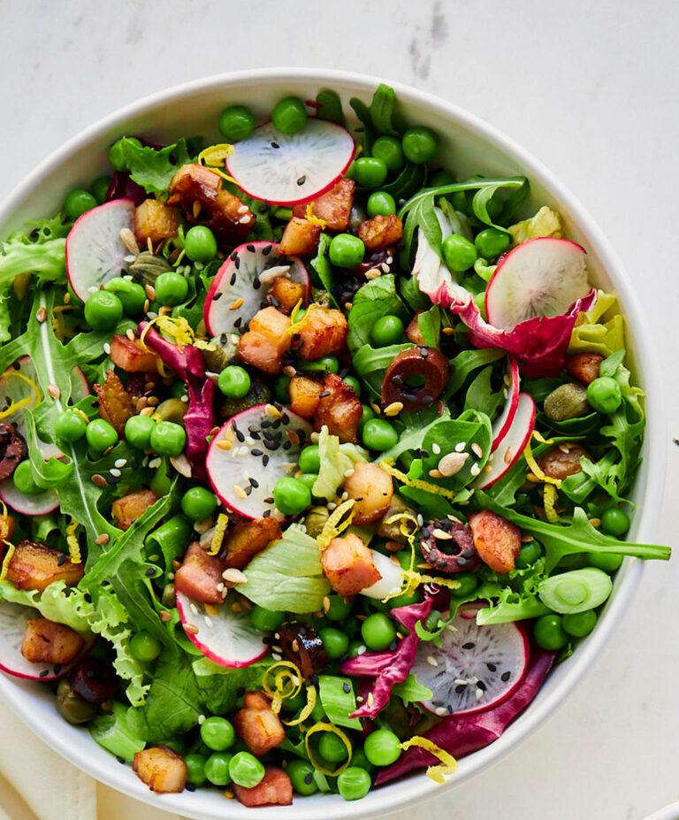- Σπάζουμε το τραγανό μπέικον σε ακανόνιστα κομμάτια και τα τακτοποιούμε στη σαλάτα.