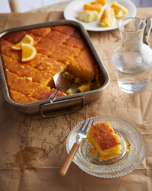 - Ξεφουρνίζουμε την πορτοκαλόπιτα και, όπως είναι καυτή, την περιχύνουμε αργά με το χλιαρό σιρόπι.
