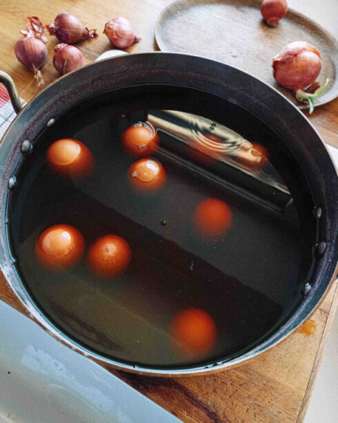 Το βάψιμο των αυγών με φυσικές χρωστικές, προερχόμενες από άγρια λουλούδια, λαχανικά ή μπαχαρικά, έχει μια συγκεκριμένη μεθοδολογία, που είναι λίγο-πολύ παρόμοια, ασχέτως της χρωστικής που θα επιλέξουμε. Το υλικό που περιέχει το χρώμα σιγοβράζει σε άφθονο νερό, στο οποίο προστίθεται στο τέλος και ξίδι (απαραίτητο συστατικό, που βοηθά τη βαφή να κάτσει πιο εύκολα πάνω στο τσόφλι και να σταθεροποιηθεί). Μετά από περίπου 1 ώρα σιγανού βρασμού, το νερό θα έχει χρωματιστεί επαρκώς. Το αφήνουμε να κρυώσει για ένα βράδυ – αν θέλουμε πιο έντονη και βαθιά απόχρωση, δεν το σουρώνουμε, ώστε το υλικό που επιλέξαμε να εκχυλιστεί κι άλλο και να βγάλει περισσότερο χρώμα. Στη συνέχεια βράζουμε τα αυγά μέσα στο χρωματισμένο νερό για περίπου 20 λεπτά. Είναι σημαντικό να επιλέξουμε λευκά αυγά, να φροντίσουμε να βρίσκονται σε θερμοκρασία δωματίου και να είναι καλά πλυμένα και με καθαρά κελύφη πριν τα βράσουμε. Θα πρέπει το νερό να τα καλύπτει οπωσδήποτε κατά δύο δάχτυλα και να μη χοροπηδούν όσο βράζουν, γιατί θα σπάσουν. Αφού κλείσουμε το μάτι, τα αφήνουμε μέσα στο νερό να κρυώσουν. Όσο περισσότερο μείνουν, τόσο πιο έντονο θα βγει το χρώμα τους. Στο τέλος, για να είναι γυαλιστερά, τα αλείφουμε με ελαιόλαδο.