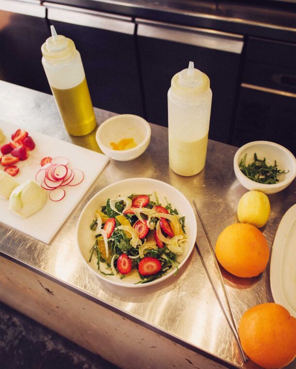 - Για την πράσινη σαλάτα με φράουλες, πορτοκάλι, μαραθόριζα και βινεγκρέτ από καρίκι Τήνου, ξεκινάμε με την βινεγκρέτ.
