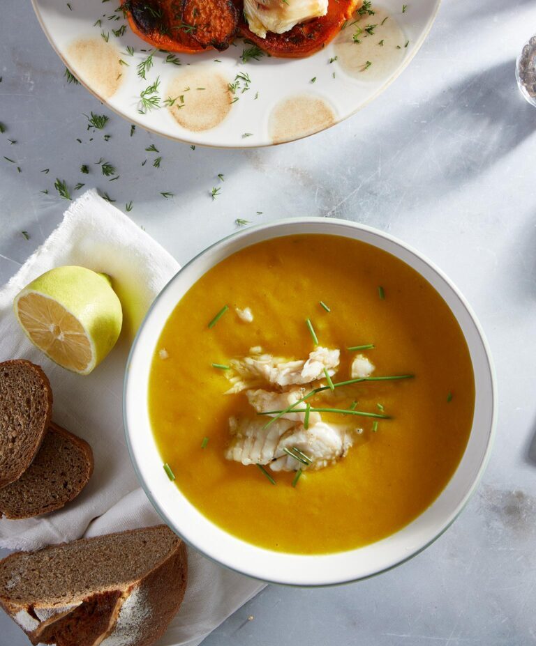 - Πολτοποιούμε τη σούπα με το ραβδομπλέντερ ή σε δόσεις στον πολυκόφτη και μοιράζουμε στα πιάτα μαζί με το ψαχνό ψαριού