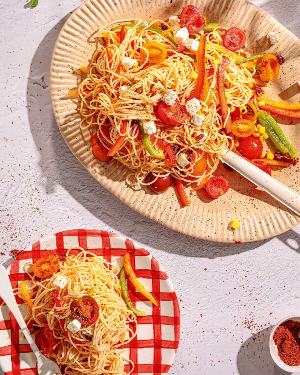 Κρουστή και δροσερή σαλάτα, απόλαυση στη γεύση αλλά και στην όψη, με τα πολύχρωμα ντοματίνια και τις πιπεριές της. Αν θέλουμε, μπορούμε να σοτάρουμε τις τρεις πιπεριές σε λίγο ελαιόλαδο μέχρι να μαραθούν, για πιο απαλή υφή.