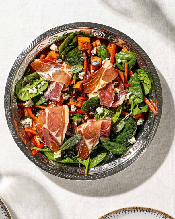 Μια πλουσιοπάροχη σαλάτα με σπέσιαλ υλικά, όλο χρώματα και αρώματα. Και τι δεν έχει: σπανάκι, φασκόμηλο, ψητές γλυκοπατάτες, μπλε τυρί, προσούτο…