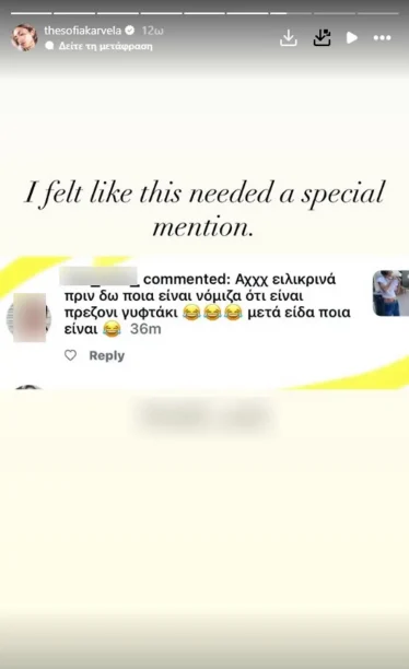 Η Σοφία Καρβέλα θέλησε να μοιραστεί το βράδυ της Παρασκευής 1η Αυγούστου ένα απαράδεκτο σχόλιο που δέχτηκε κάτω από ανάρτησή της, επιλέγοντας ωστόσο να το αναδείξει με χιούμορ.