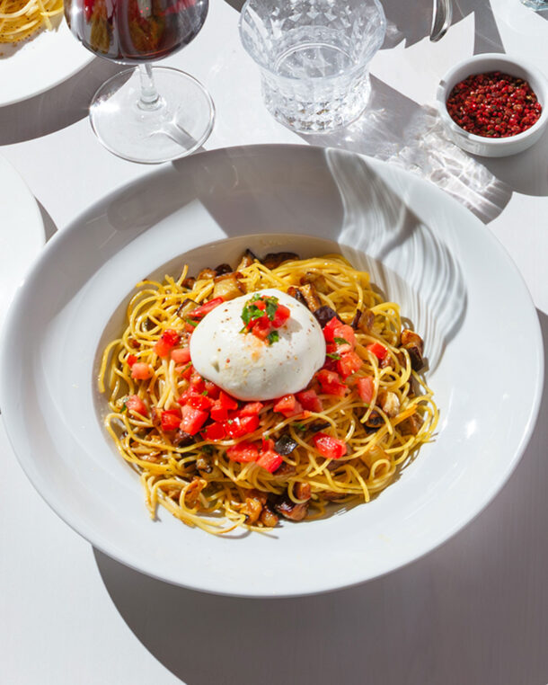 Μια μακαρονάδα γεμάτη γεύση, με μελιτζάνες και ντομάτες από τα καλοκαιρινά μποστάνια και την βουτυράτη γεύση του ζουμερού ιταλικού τυριού που ακούει στο όνομα mozzarella burrata.