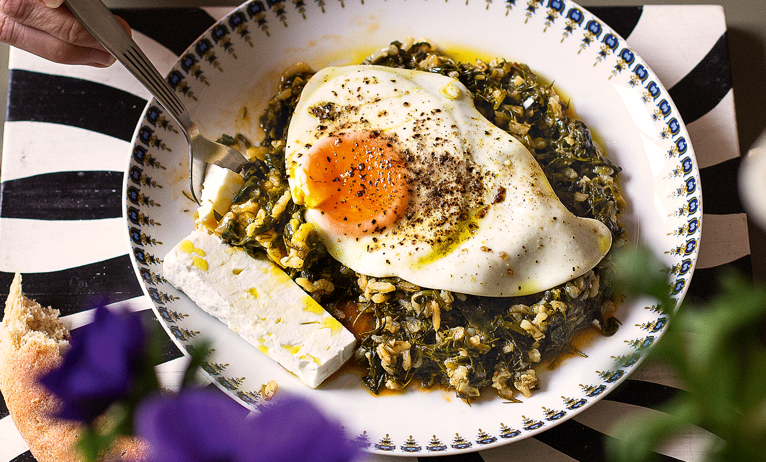 Βάζουμε το σπανακόρυζο σε ένα πιάτο, από πάνω ακουμπάμε το αυγό μάτι, συνοδεύουμε με ένα κομμάτι τυρί φέτα και φρέσκο ψωμί και δεν θέλουμε τίποτε άλλο.
