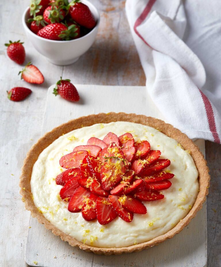 - Στολίζουμε με τις φράουλες, σκορπίζουμε το ξύσμα λεμονιού και σερβίρουμε την τάρτα φράουλας με κρέμα βανίλιας.