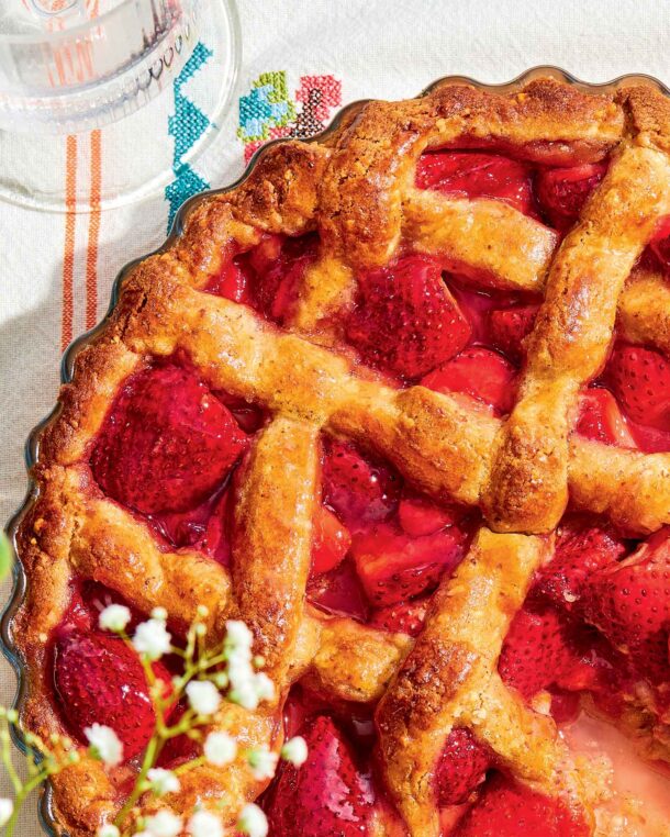 Αμύγδαλα, τζίντζερ και κανέλα στη ζύμη, βανίλια και ρούμι στη φραουλένια γέμιση. Μια τάρτα όλο άρωμα έχουμε εδώ, σκεπασμένη με ζυμαρένιες λωρίδες σαν πάστα φλώρα, που μπορούμε να σερβίρουμε αν θέλουμε με παγωτό.