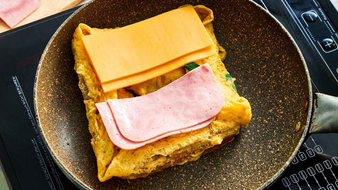- Αφήνουμε την ομελέτα με το ψωμί να ψηθεί από τη μία πλευρά και με μια σπάτουλα τη γυρίζουμε από την άλλη.