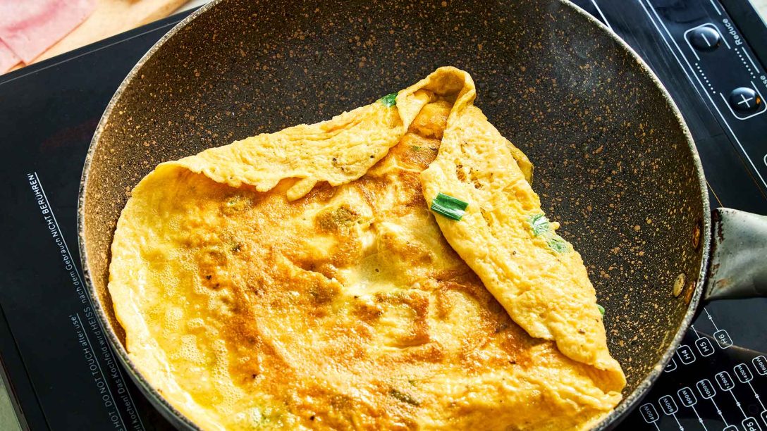 - Αλείφουμε με λίγο λάδι ένα μικρό τηγάνι και το βάζουμε σε δυνατή φωτιά. Ρίχνουμε το μείγμα των αυγών και το απλώνουμε σε όλο τον πάτο του τηγανιού, σε μια λεπτή ομελέτα.