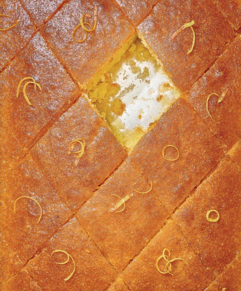 - Ξεφουρνίζουμε το γλυκό και με μια κουτάλα περιχύνουμε όλη την επιφάνεια με το χλιαρό σιρόπι.
