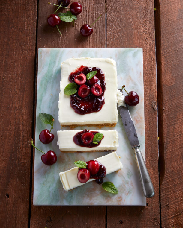 Ένα από τα πιο διάσημα τσίζκεϊκ στον κόσμο, το πληθωρικό ψητό τσίζκεϊκ της Νέας Υόρκης, σ’ αυτή τη εκδοχή του σερβίρεται με φρέσκα κεράσια και μαρμελάδα κεράσι και μας ξεμυαλίζει.