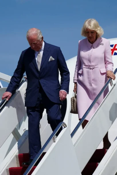 Κατά την άφιξη στο αεροδρόμιο η Βασίλισσα Καμίλα έκλεψε τις εντυπώσεις ήδη από την άφιξη, επιλέγοντας ένα ροζ coat dress από τον οίκο Dior, το οποίο συνδύασε με μια εντυπωσιακή καρφίτσα από Cartier.